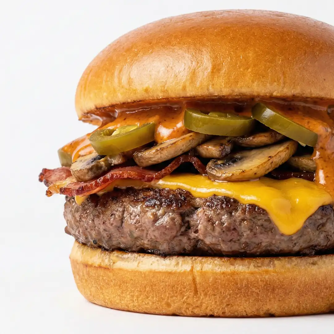 Burger mit 200 g Rinderpatty, Rinderbacon, gebratenen Champignons, Käse, Jalapenos und scharfer Chilli-Cheese-Soße.