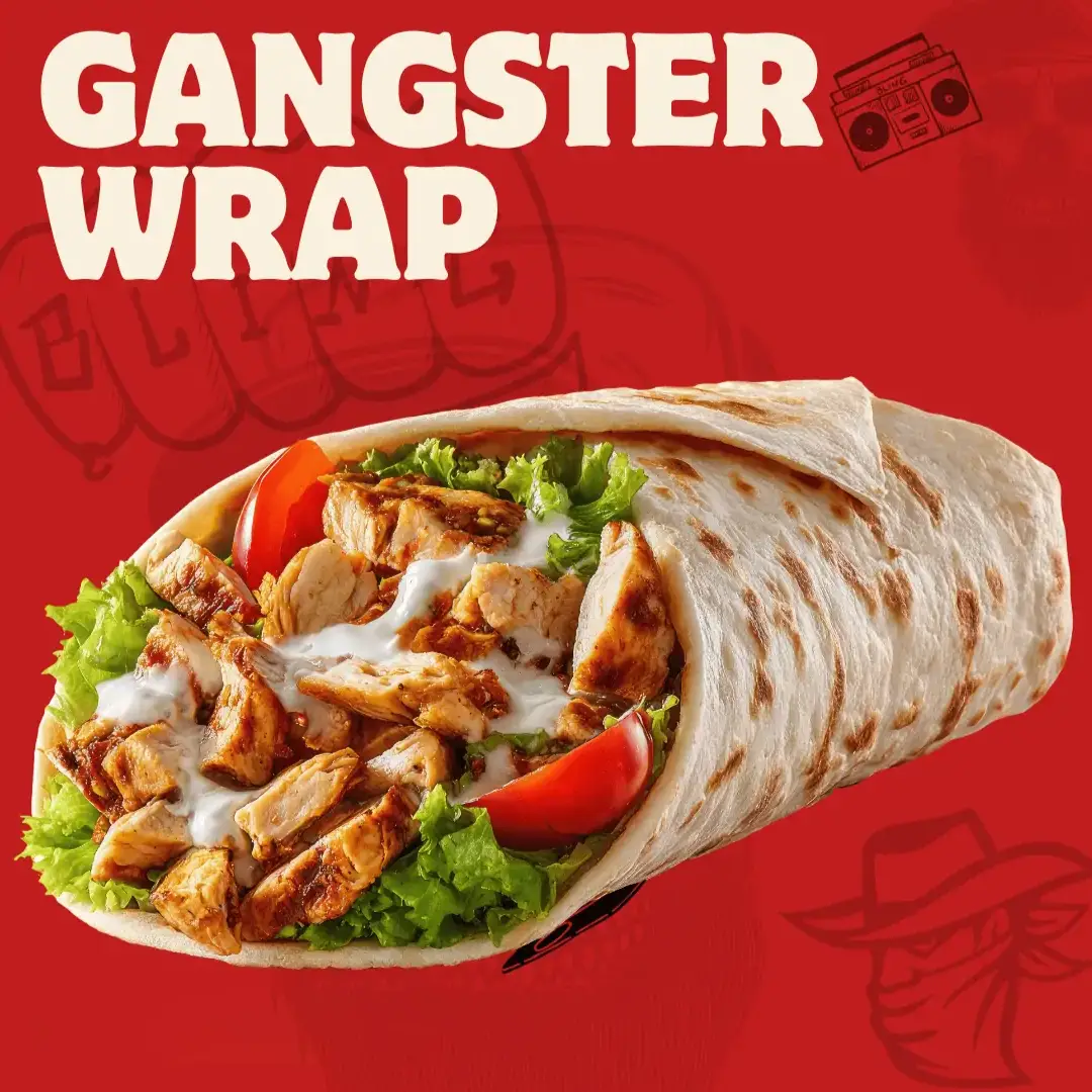 Gangster Wrap – Eisbergsalat, Tomaten, Röstzwiebeln und Hähnchenfleischstreifen mit hausgemachter Soße.