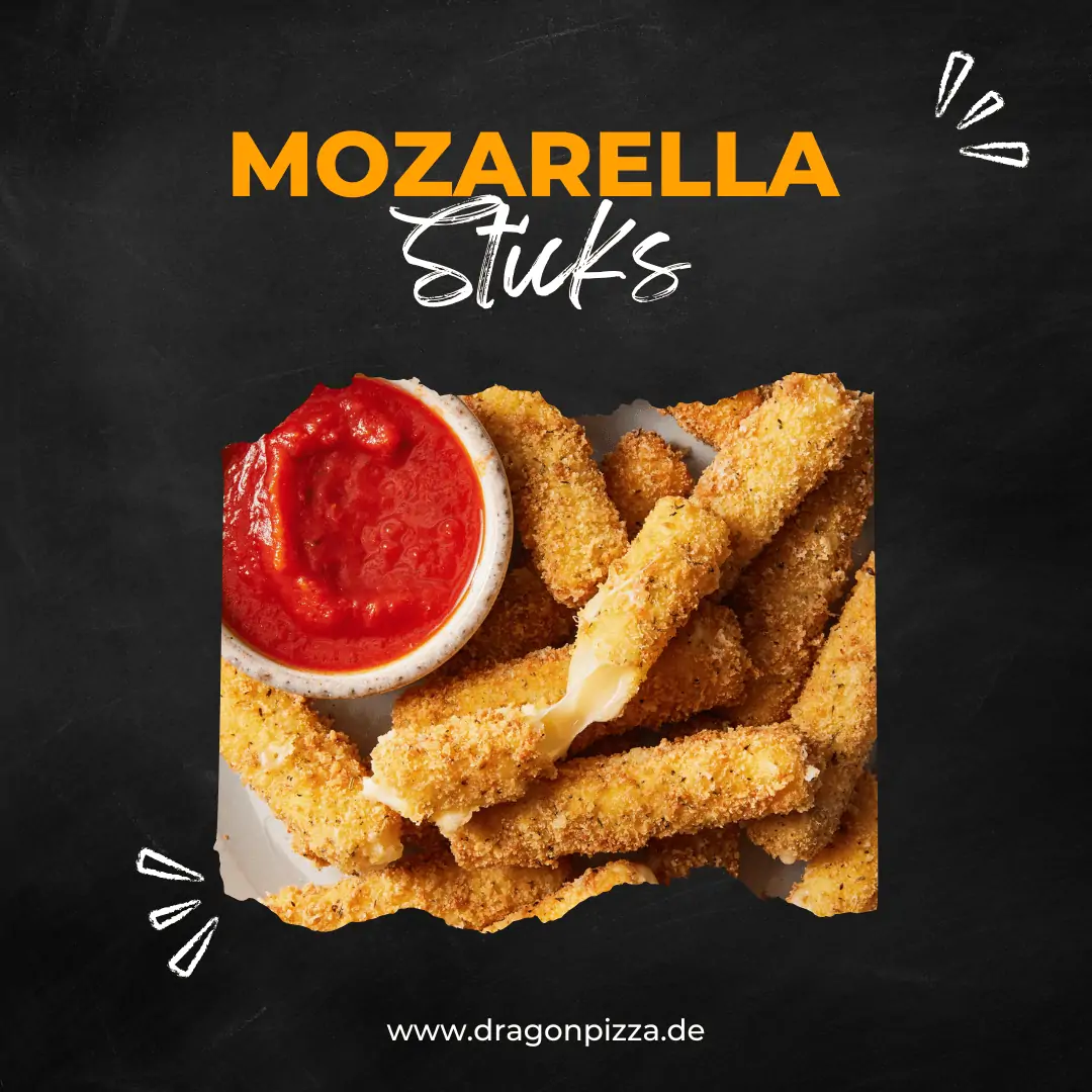 Mozzarella Sticks: 6Stück knusprig panierte Käse-Sticks mit zart schmelzendem Mozzarella, inklusive Dip nach Wahl.