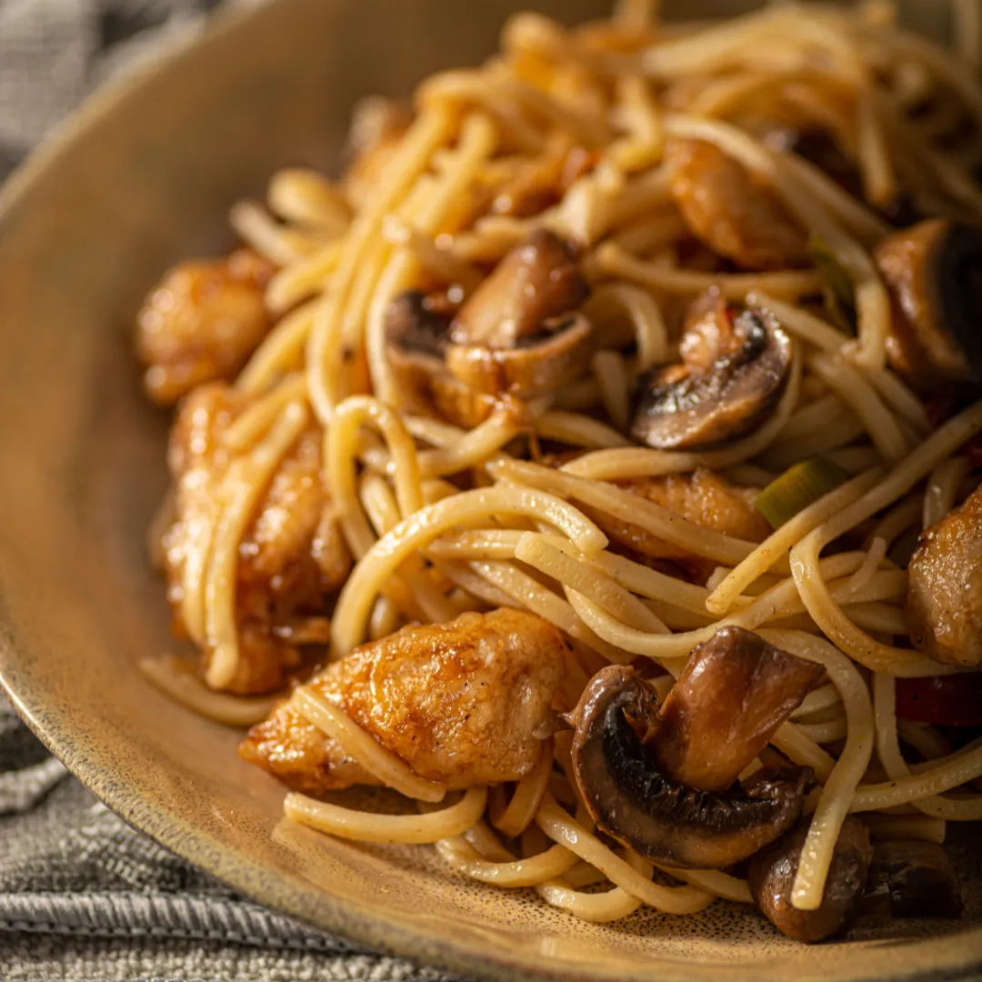 Pasta mit Hähnchenfleisch und Champignons in Sahnesoße, serviert mit einer Nudelsorte nach Wahl (Tortellini, Penne oder Spaghetti).
