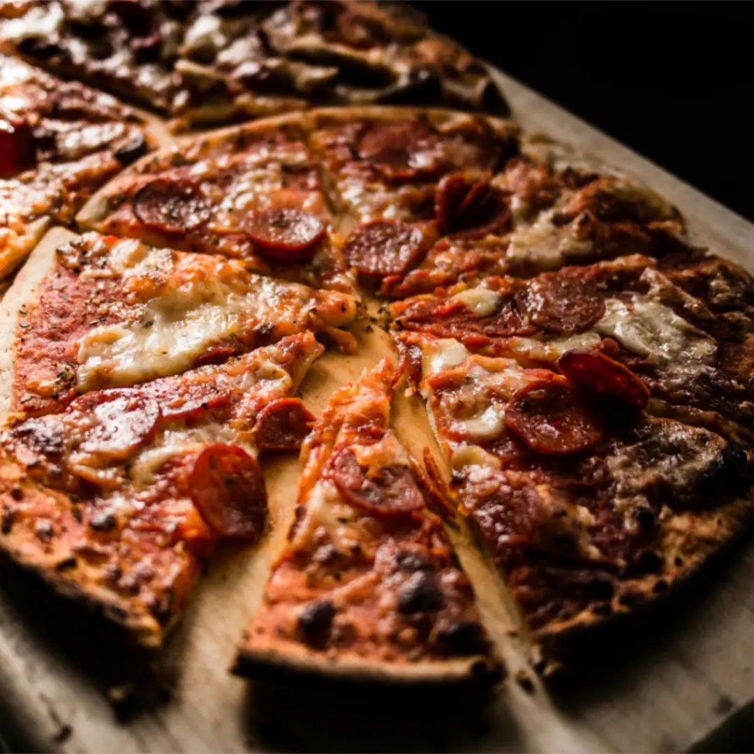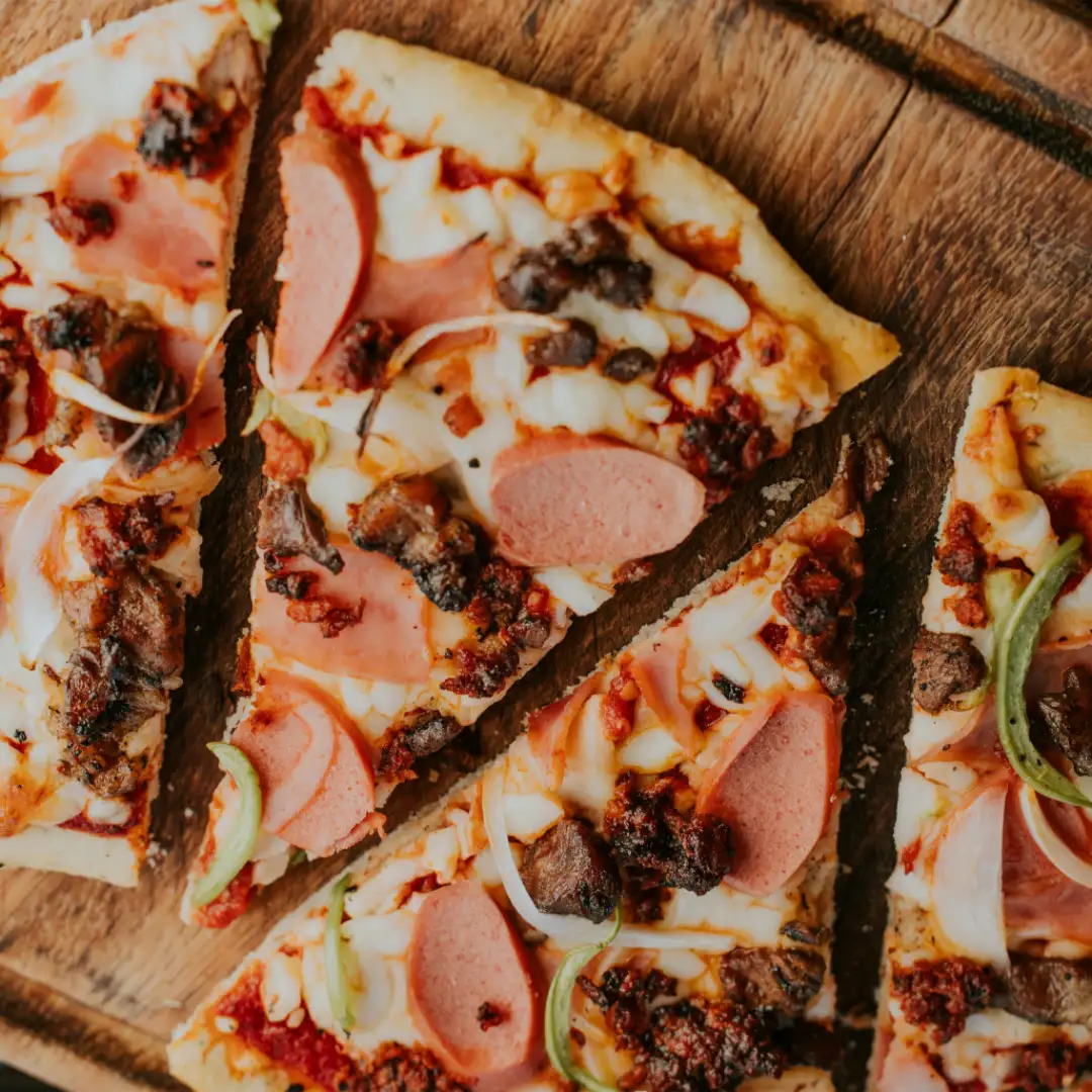 Pizza Dragneel mit BBQ Soße als Belagsoße, 100% Rinderhackfleisch, 100% Rinderbacon, roten Zwiebeln und Käse.