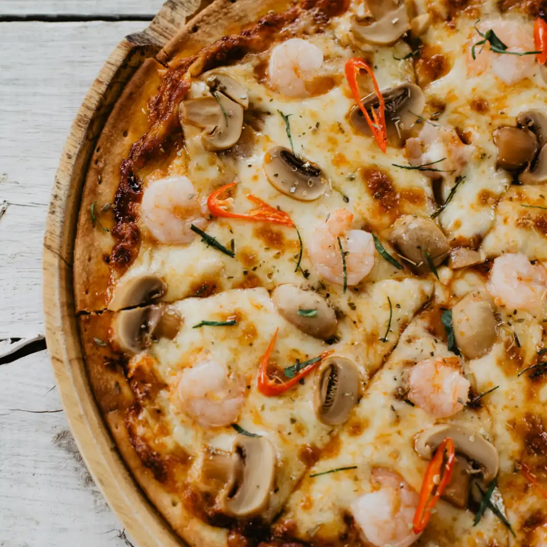 Pizza Ocean Master mit Tomaten Soße, Meeresfrüchten, Brokkoli, Lauchzwiebeln, Cocktailtomaten und Käse.
