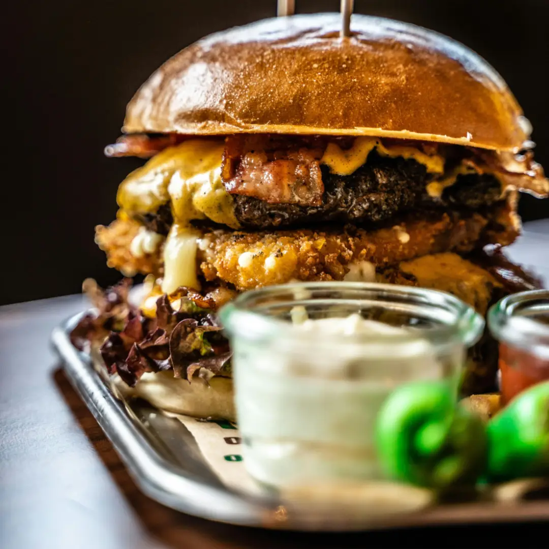 Großer Burger mit drei 125 g Rinderpatties, dreifachem Cheddarkäse, Eisbergsalat, Tomaten, roten Zwiebeln, dänischen Gurken und Burgersoße.