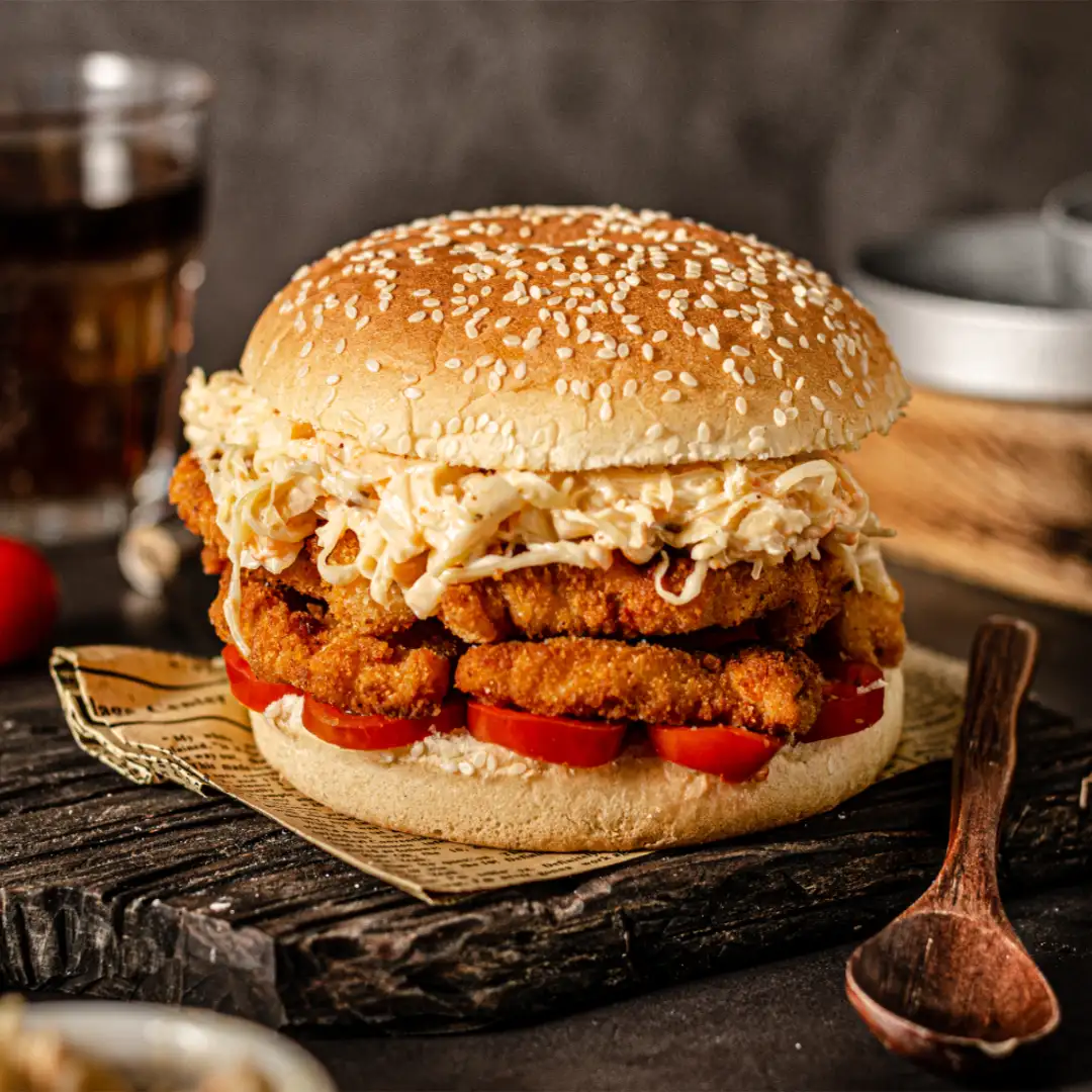 Doppelter Chickenburger mit zwei 90-g-Crispy-Chickenpatties, doppeltem Cheddarkäse, Eisbergsalat, Tomaten, roten Zwiebeln, dänischen Gurken und Burgersoße.